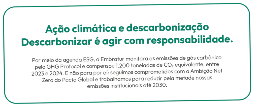 A Embratur está só começando! Nos próximos anos, a Agência vai ampliar ações regenerativas, acelerar a descarbonização, avançar no selo Lixo Zero e integrar os compromissos ESG à promoção internacional. O objetivo é fazer do Brasil um destino ainda mais vibrante, diverso e sustentável – preparado para liderar o turismo verde no mundo.