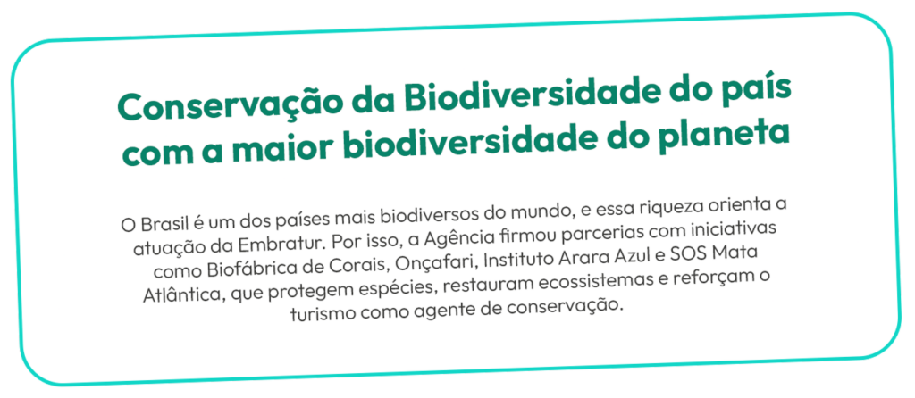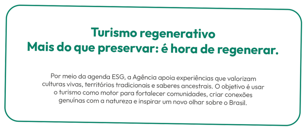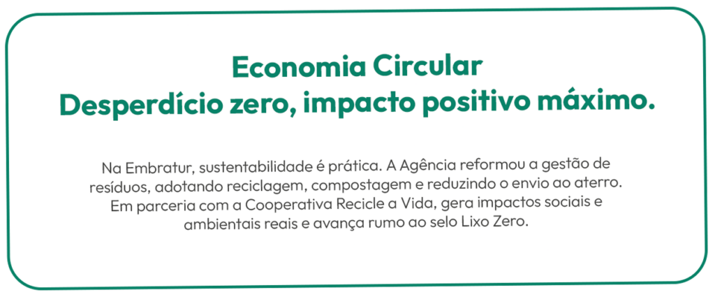 Na Embratur, sustentabilidade não é tendência: é o jeito de pensar o turismo que queremos entregar ao mundo. A Agência vive um novo momento, com mais responsabilidade, mais inovação e mais conexão com os brasileiros. Trata-se de cuidar das pessoas, dos biomas e das histórias que tornam o Brasil único. Por isso, a cada ação, buscamos deixar um impacto positivo, dentro e fora da Agência.